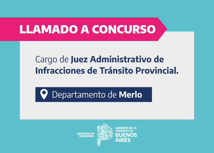 El Ministerio de Transporte de la Provincia de Buenos Aires, a través de la Resolución N° 210/22, autoriza el llamado a Concurso de Antecedentes para cubrir una vacante en el cargo de Juez Administrativo de Infracciones de Tránsito Provincial, para cumplir funciones en el departamento Merlo.