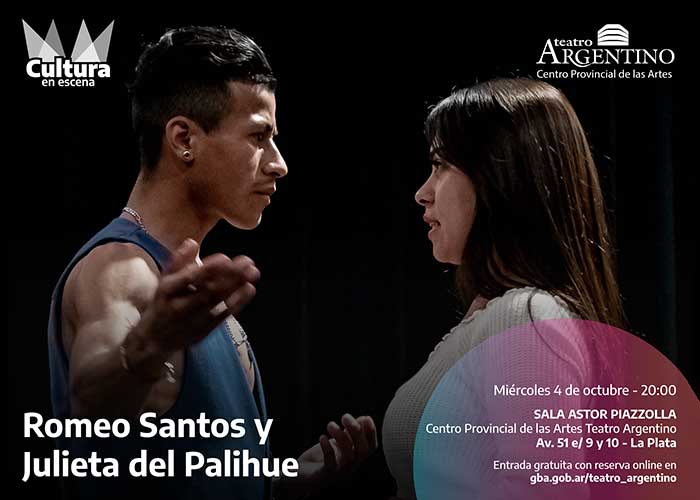 En una nueva edición de “Cultura en Escena en el Argentino”, el Instituto Cultural de la Provincia de Buenos Aires presenta “Romeo Santos y Julieta del Palihue”. La obra teatral fue producida por el grupo de teatro “Oriyero” y cuenta con dramaturgia y dirección de Blas Arrese Igor. La función será el miércoles 4 de octubre a las 20:00 en la Sala Astor Piazzolla del Centro Provincial de las Artes Teatro Argentino de La Plata (Avenida 51 entre 9 y 10).